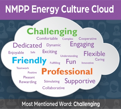 The graphic shows the words most frequently used by NMPP Energy employees in response to a survey question: “What three words best describe your work environment?”