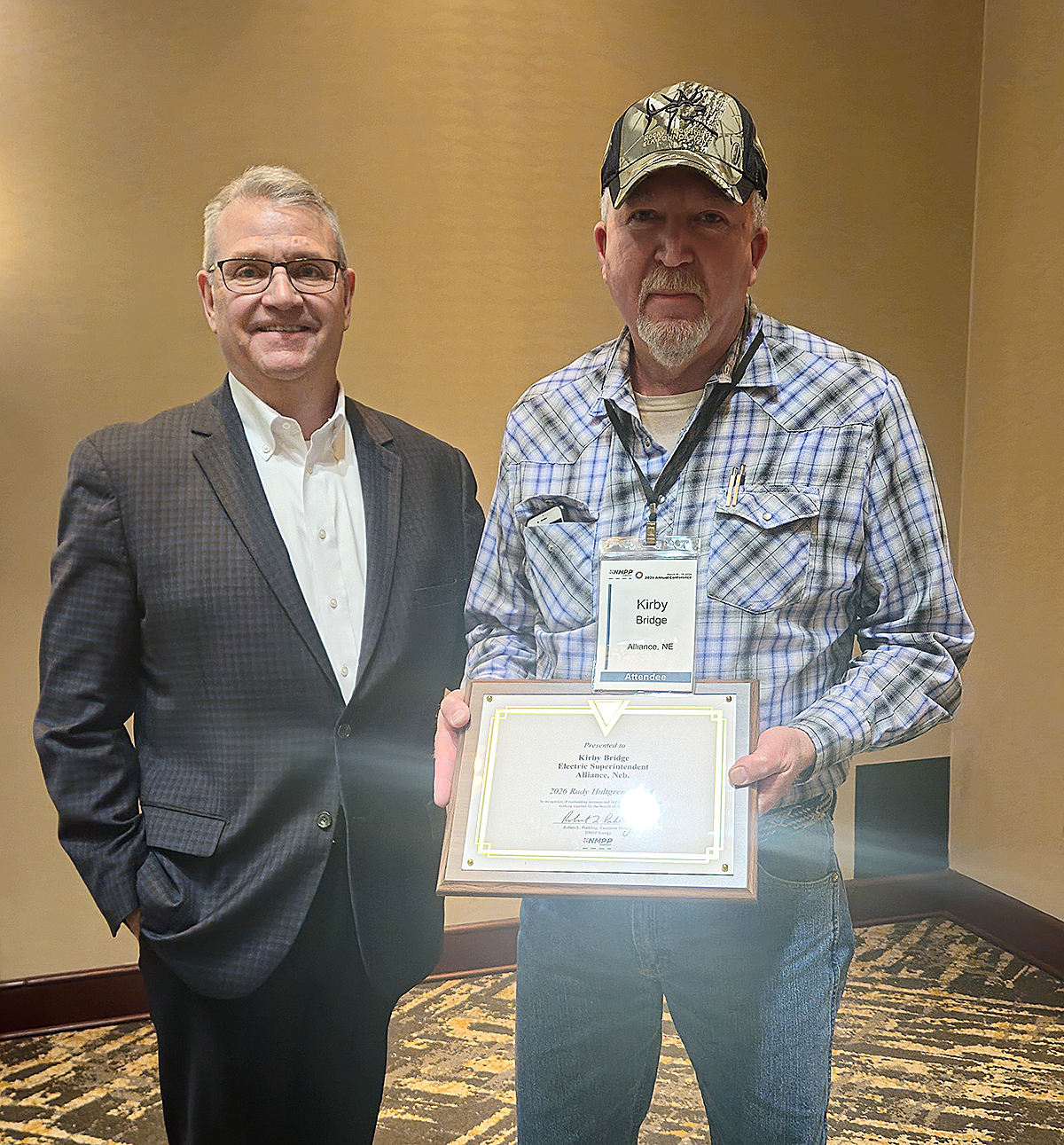 The Municipal Energy Agency of Nebraska (MEAN) presented Kirby Bridge, electric superintendent for the City of Alliance, Neb., with its Rudy Hultgren Dedicated Service Award March 18 at the NMPP Energy Annual Conference in Lincoln, Neb.